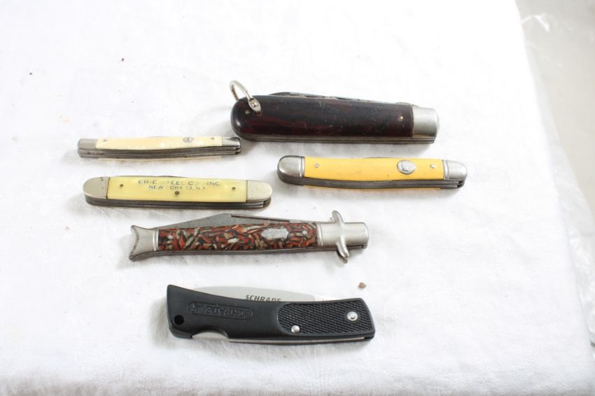Group of Pocket Knives- Schrade, Imperial, Camco - When folded 4" long each. Lot size: 5 x 5 x 5", 1.5 lbs Photos are part of description (Live Auctioneers only shows up to 20). Please ask questions and read terms & conditions before bidding.