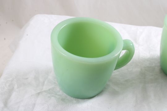 2 Fire King Jadeite C Handle Cups - One cup has a couple of flea bites on rim. 1 Lb. 7 oz.. Lot Size 8" x 3 1/2" x 3". Photos are part of description (Live Auctioneers only shows up to 20). Please ask questions and read terms & conditions before bidding.