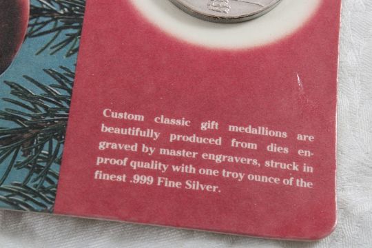 1986 Medallion 1 Troy Oz. .999 Pure Silver - Merry Christmas Silver Medallion. 8 Oz. Lot Size 7" x 5" x 1". Photos are part of description (Live Auctioneers only shows up to 20). Please ask questions and read terms & conditions before bidding.