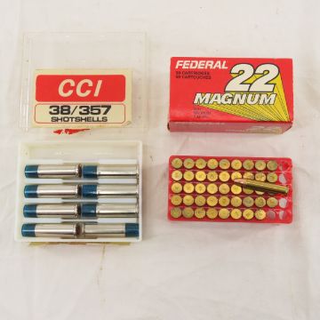 45 Rds 22 Mag & 274 Mixed .38/.357 Mag Cartridges - 1) 100 rds Winchester .38 Special 130 gr FMJ in box. 2) 36 Harrington .38 special semi-wadcutter, and 9 Federal .38 special semi-wadcutter, 1 REM UMC 38, in yellow plastic box. 3) 19 rds Hornady criticaldefense .38 special 110gr FTX and 1 REM UMC 38 special in box. 4) 8 rds CCI 38/357 shotshells. 5) 49 rds Winchester WINCLEAN 357 magnum 125 gr JSP. 6) 12 rds & 15 cases CI 357 mag, 1 S&W 357 mag, 6 Hornady 357 7) 45rds Federal 22 MAG in box. Lot size: 13 x 8 x 3", 10 lbs Photos are part of description. Live Auctioneers displays a max of 20 photos- all photos can be seen on Proxibid and bid.anewdayauctions.com. Please ask questions and read terms & conditions before bidding.