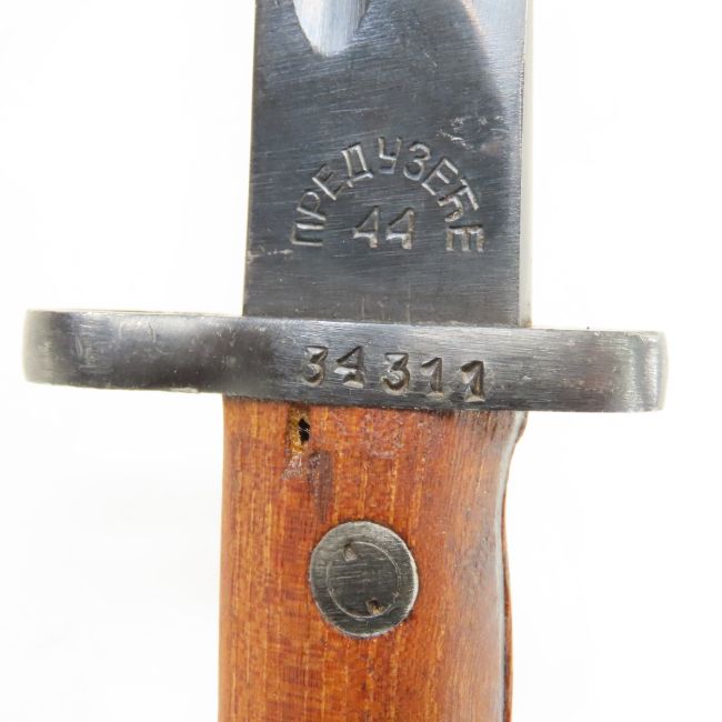 Yugoslavian Military M1948 Bayonet & Scabbard - Blade: 9.75", OAL: 15", Ricasso: [Serbian Cyrillic text] over 44, Hilt: 34311, Frog Stud: 56849, Scabbard Throat: 44 inside of Pyramid. Lot size: 15 x 3 x 3", 2 lbs Photos are part of description. Live Auctioneers displays a max of 20 photos- all photos can be seen on Proxibid and bid.anewdayauctions.com. Please ask questions and read terms & conditions before bidding.