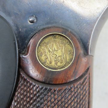 Smith & Wesson Model of 1905.32 Win CTG Revolver - hand ejector 2nd change, SN# 32571, manufactured 1906-07, with 6 shot cylinder SN# 34342. Top strap of 6.5" round barrel marked: "SMITH & WESSONSPRINGFUELD MASS,USA PAT'D APR 9.89 MAR 27.94 / MAY 21.95 JULY16.95 AUG 4.96 DEC 22.96. OCT 4.98. OCT 8.01. DEC 17.01", left side marked ".32 WINCHESTER CTG". Front blade sight, adjustable rear sight, knurled hammer, round butt, checkered wood grips with brass logo medallion. C&R orFFL transfer required. Please know local laws before bidding. Lot size: 12 x 6 x 2", 1.14lbs Photos are part of description. Live Auctioneers displays a max of 20 photos- all photos can be seen on Proxibid and bid.anewdayauctions.com. Please ask questions and read terms & conditions before bidding.