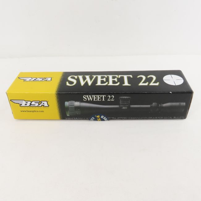 BSA Sweet 22 3-9x40mm Scope - adjustable objective, in box. Lot size 15 x 4 x 4", 2lbs Photos are part of description. Live Auctioneers displays a max of 20 photos- all photos can be seen on Proxibid and bid.anewdayauctions.com. Please ask questions and read terms & conditions before bidding.