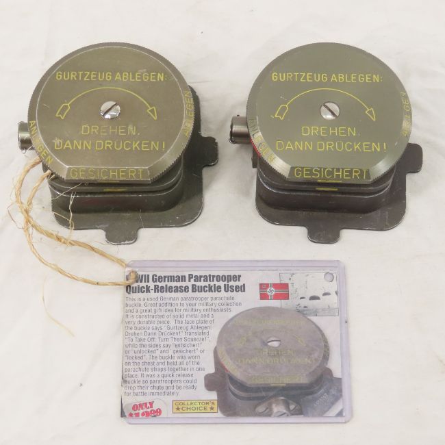 WWII German Ammo Pouch, Fuze Holder & more - Leather ammo Belt pouch, 2 paratrooper quick release buckles, Daimon M135 Flashlight, Signal Flair cartridge, Replica Stick Grenade, 8mm Fuze Holder. Lot size: 15 x 10 x 5", 6 lbs Photos are part of description. Live Auctioneers displays a max of 20 photos- all photos can be seen on Proxibid and bid.anewdayauctions.com. Please ask questions and read terms & conditions before bidding.