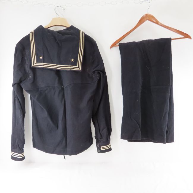 WWII US Navy Enlisted Dress Blue Wool Jumpers - 5 Jumpers, 3 Pair Wool Pants, Some named to HENKE. Patches represent Navy Musician/1st Class Petty Officer rating & Fire Control Technician/Petty Officer Second Class rating. Some damages, holes. Lot size: 17 x 12 x 9", 13 lbs Photos are part of description. Live Auctioneers displays a max of 20 photos- all photos can be seen on Proxibid and bid.anewdayauctions.com. Please ask questions and read terms & conditions before bidding.