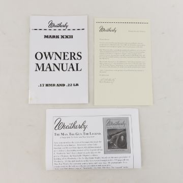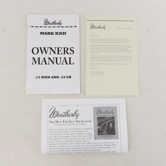 Weatherby Mark XXII .22 LR Bolt Action Rifle - SN# AS007568, mfg 2007-2011 Made in Germany, semi-auto, 22" barrel, scope mount, checkered wood pistol grip stock with raised cheek comb, 1 5rd .17 HMR/.22LR magazine. with original box, lock, sling mounts.Excellent condition. FFL transfer required. Please know local laws before bidding. Lot size: 48 x6 x3", 8 lbs Photos are part of description. Live Auctioneers displays a max of 20 photos- all photos can be seen on Proxibid and bid.anewdayauctions.com. Please ask questions and read terms & conditions before bidding.