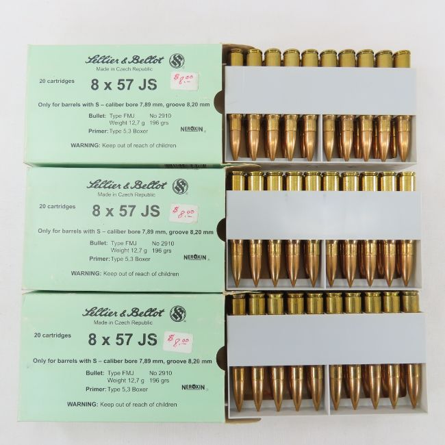 60 Rounds Czech 8x57 JS Ammunition in Boxes - 60 Rounds Sellier & Bellot, Czech 8x57 JS Ammunition, 196 grain. Lot Size: 6 x 4 x 4", 4 lbs Photos are part of description. Live Auctioneers displays a max of 20 photos- all photos can be seen on Proxibid and bid.anewdayauctions.com. Please ask questions and read terms & conditions before bidding.