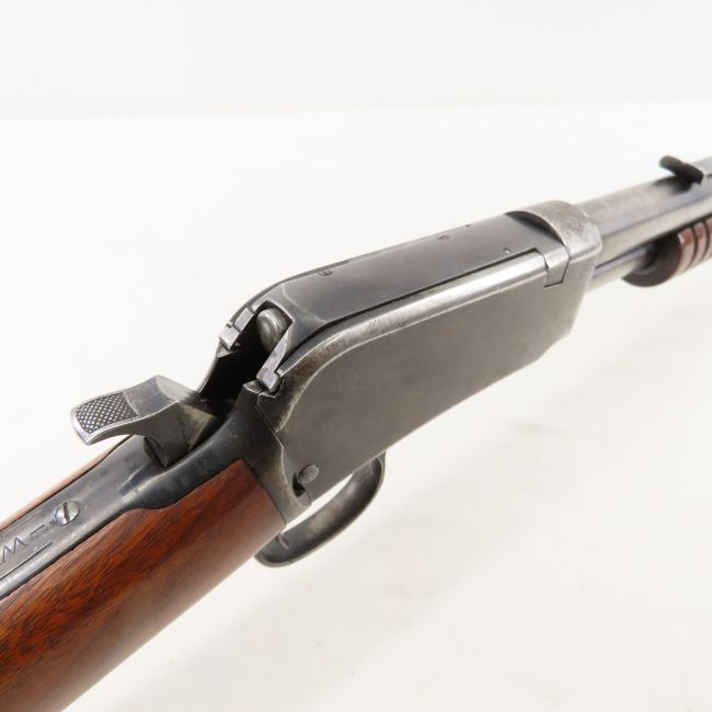 Winchester Mod 06 .22 S,L,LR Takedown Rifle - SN# 637635 B, mfg between 1911-1932, slide action, 20" barrel, front blade and rear sight, tube feed, wood ribbed forearm, and straight wood stock, with vintage canvas takedown case. Overall good condition, bluing wear - electro-stenciled serial number on receiver as well. C&R or FFL transfer required, please know local laws before bidding. Lot size: 28 x9 x4", 6 lbs Photos are part of description. Live Auctioneers displays a max of 20 photos- all photos can be seen on Proxibid and bid.anewdayauctions.com. Please ask questions and read terms & conditions before bidding.