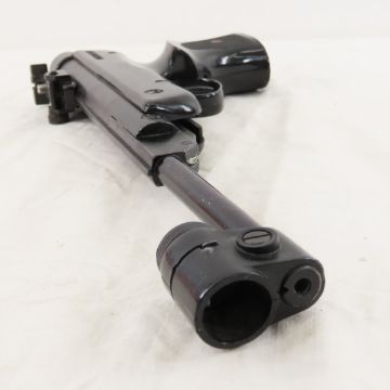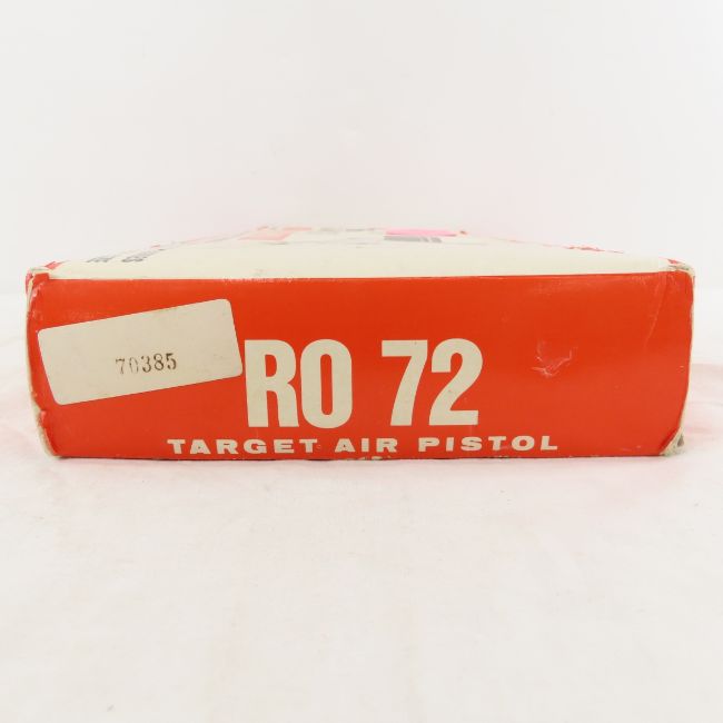 RO 72 Bullseye Italian .177 Target Air Pistol - break barrel, single shot, works well, very good condition, hooded front sight. In original foam tray with lid. Please know local laws before bidding. Lot size: 15 x 7 x 2.5", 2.8 lbs Photos are part of description. Live Auctioneers displays a max of 20 photos- all photos can be seen on Proxibid and bid.anewdayauctions.com. Please ask questions and read terms & conditions before bidding.