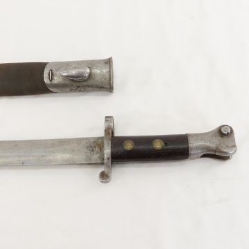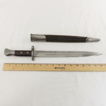 2 BSA Long Lee Enfield .303 Rifles & Bayonet - 1) SN# 20285, circa 1900, import: CIA St. Alban VT, 29.5" barrel with front ramp blade & rear leaf sight, bolt action, magazine cut off, detachable box magazine. 48.5" OAL, several repairs to stock, with worn canvassling. Normal to heavy wear for age. C&R or FFL transfer required. 2) Missing Stock: SN# 20512, 29.5" barrel - looks to have bulge just below front ramp blade sight, incomplete rear sight, bolt action,detachable box magazine. No butt plate and other missing parts, 48.5" OAL, C&R or FFL transfer required. Please know local laws before bidding. Pattern 188 Bayonet, pommel marked 227,ricasso has proof marks, 12" blade, 16.5: OAL, with leather scabbard. Lot size: 49 x 12 x 6", 18 lbs Photos are part of description. Live Auctioneers displays a max of 20 photos- all photos can be seen on Proxibid and bid.anewdayauctions.com. Please ask questions and read terms & conditions before bidding.