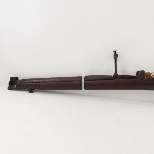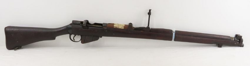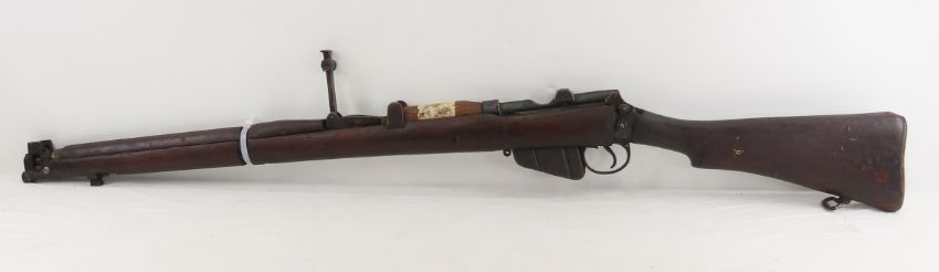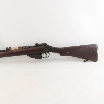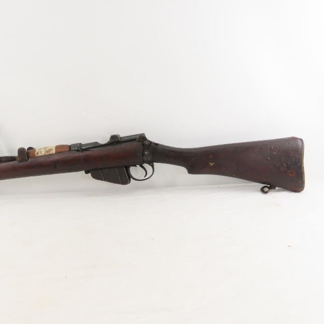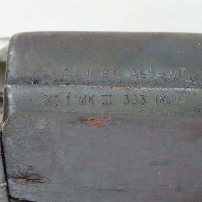 1946 Lee-Enfield No I Mk III* .303 Rifle - SN# 39459V , Wrist marked: "No I Mk III* FR'46", FR= Factory Repair India, MISSING BOLT, 26" barrel, front sight with ears, rear ladder sight, missing front band, wood stock with filled disc slot, sling loops, 10 round detachable magazine, trap door butt plate. Typical wear for age. C&R or FFL transfer required. Please know local laws before bidding. Lot size: 44 x6 x4", 8lbs Photos are part of description. Live Auctioneers displays a max of 20 photos- all photos can be seen on Proxibid and bid.anewdayauctions.com. Please ask questions and read terms & conditions before bidding.
