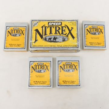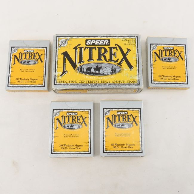 Ammunition: 275 Rds Speer Nitrex .300 Weatherby - and 5 cases. 13 full boxes, 1 box as 15 rds & 5 cases. Lot size: 10 x 9 x 8", 23 lbs Photos are part of description. Live Auctioneers displays a max of 20 photos- all photos can be seen on Proxibid and bid.anewdayauctions.com. Please ask questions and read terms & conditions before bidding.