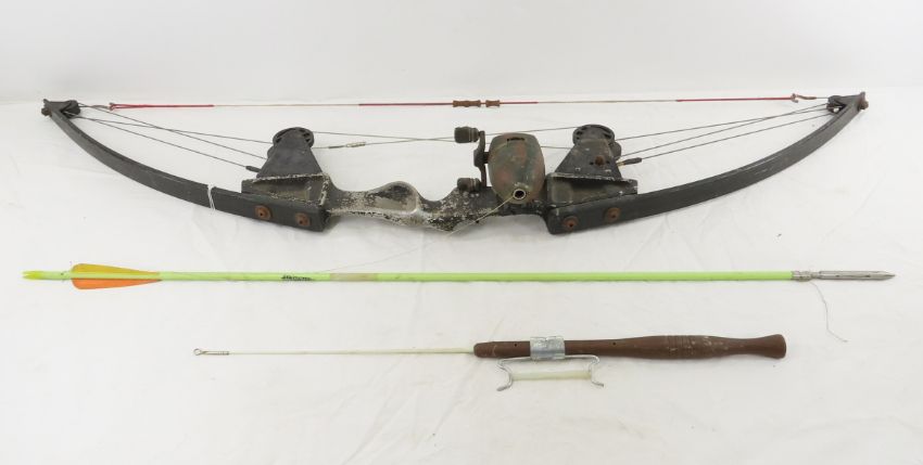 Herter's Compound Fishing Bow with Arrow - 50#, 29", B.M.H. 776008, well used condition, with ice fishing rod. Lot size: 44 x 12 x 6", 4.5 lbs Photos are part of description. Live Auctioneers displays a max of 20 photos- all photos can be seen on Proxibid and bid.anewdayauctions.com. Please ask questions and read terms & conditions before bidding.