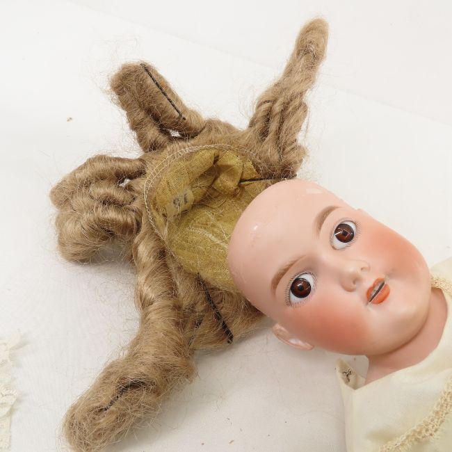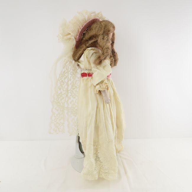 2 Antique A. Marseilles Floradora Dolls - 1) 23" bisque socket head marked Floradora A 3 M with fixed eyes, painted lashes, and open mouth with teeth, no pate, kid leather body with cloth lower legs. New hat and wig, vintage clothing. on stand. 2) 16" bisquesocket head marked made in Germany Armand Marseilles Floradora A 0 M, with sleep eyes, painted lashes, open mouth with teeth, ball jointed compo body, in new outfit, on stand. Have been displayed- may not be complete orall original. Lot size:24x12x12", 6 lbs Photos are part of description. (Live Auctioneers only shows a max of 20 photos). Please ask questions and read terms & conditions before bidding.