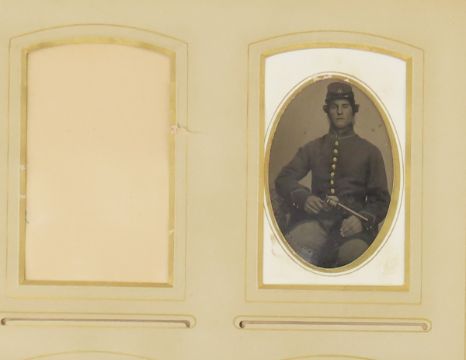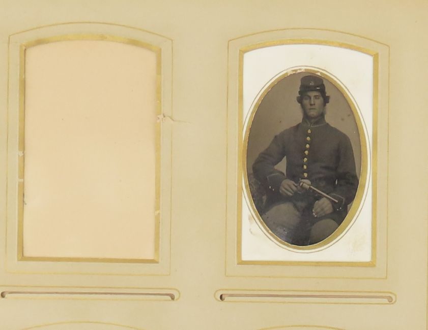 Antique Cabinet Cards, Photos & Albums - 1 celluloid album which includes image of civil war soldier with revolver. largest photo on matte is 10x14". Lot size: 14x11x6", 11.4 lbs. Photos are part of description. (Live Auctioneers only shows a max of 20 photos). Please ask questions and read terms & conditions before bidding.