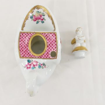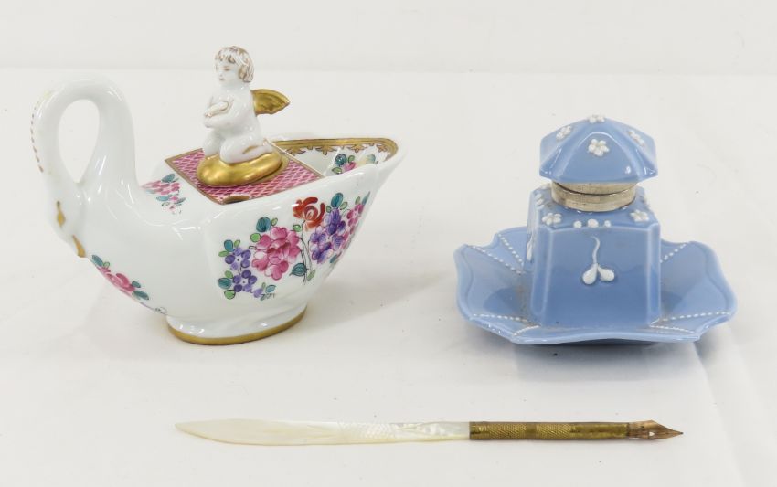 2 Antique Porcelain Ink Wells & 1 MOP Pen - blue is German marked 02169 with hinged lid, and white floral swan with cherub is Asian export from France, and Mother of pearl pen. Lot size: 8x7x5", 1 lb Photos are part of description. (Live Auctioneers only shows a max of 20 photos). Please ask questions and read terms & conditions before bidding.