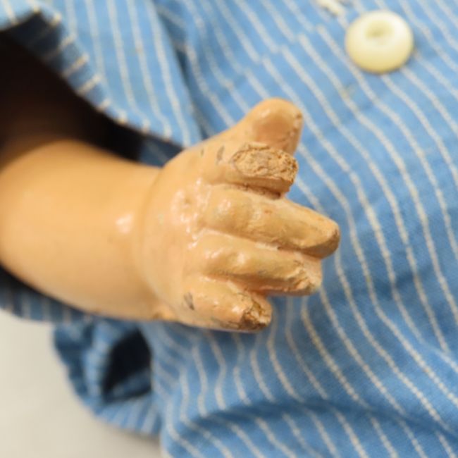 3 Antique Composition & Cloth Baby Dolls - All 3 are unmarked, have compo heads, arms and legs with cloth bodies. 1) 14" with all painted face, damaged finger, some crazing, 2) 14" in pink coat, sleep eyes, some crazing, crier not working, 3) 15" with curly hair and sleep eyes, shoulder head, some discoloration and crazing. All have been displayed- may not be complete or all original. Lot size: 16x10x12", 4.3lbs Photos are part of description. (Live Auctioneers only shows a max of 20 photos). Please ask questions and read terms & conditions before bidding.
