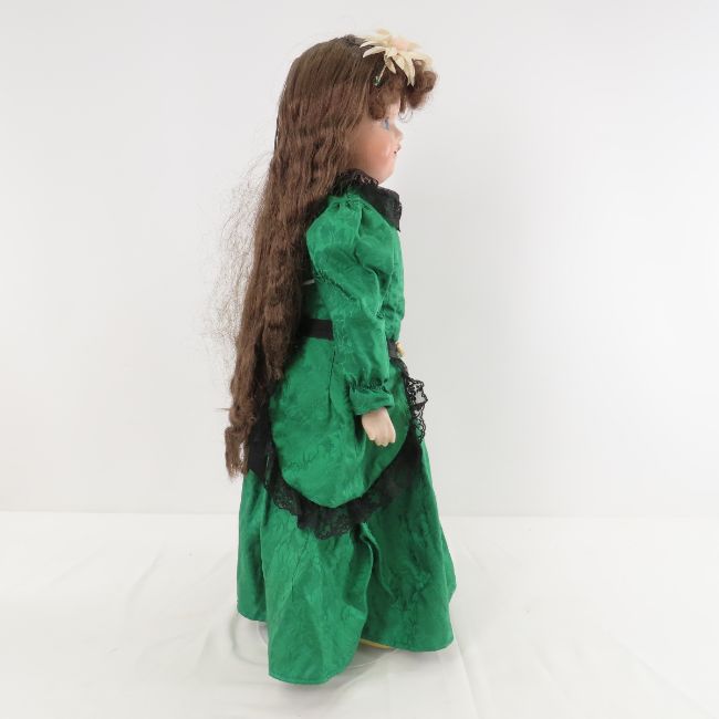 2 Pre-1921 RE Nippon Bisque Head Dolls - Both have bisque shoulder heads with sleep eyes, painted lashes and open mouth with teeth, are marked RE inside crossed diamond and Nippon. Kid leather bodies, bisque hands and compo lower legs, and on stands. 1) 21"in green dress has larger eyes and head, and newer wig. 2) 20" in white, has an older wig and a slightly smaller head. Have been displayed- may not be complete or all original. Lot size: 22x16x8", 6.6lbs Photos are part of description. (Live Auctioneers only shows a max of 20 photos). Please ask questions and read terms & conditions before bidding.