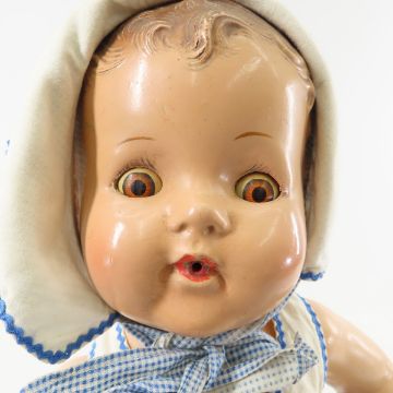 Compo Drink & Wet and Other Dolls - 1) 18" unmarked drink & wet compo baby doll with molded hair and sleepy eyes. 2) 10" unmarked black compo has cracked head and torso. 3) 7" unmarked compo baby- damage on 1 leg and crazing 4) Arnett's country storepainted black wood resin doll 8". And 2 plastic & 1 celluloid black baby dolls. All have been displayed- may not be complete or all original. Lot size:16x12x10", 4 lbs Photos are part of description. (Live Auctioneers only shows a max of 20 photos). Please ask questions and read terms & conditions before bidding.