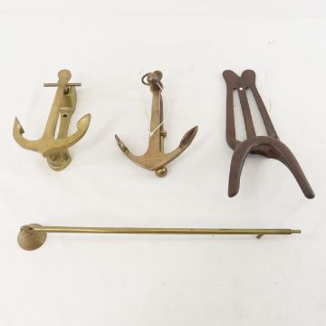 Vintage Brass Nautical Door Knockers & Decor - 2 Solio Brass Anchor Door Knockers, Car Horn, Candle Snuffer, Trivet, Boot Jack, Necklace & more. Lot Size: 18 x 15 x 6", 8 lbs Photos are part of description. (Live Auctioneers only shows a max of 20 photos). Please ask questions and read terms & conditions before bidding.