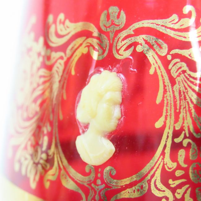 Italian Gold Trim Ruby Red Glass, Fenton & More - Fenton heart & vine Ruffled Carnival Glass Bowl, Italian Ruby Red gold trim decanter set with 4 Glasses, Ruby Red lidded candy dish. Red Vase is 12" tall- chip on bottom. Lot Size: 16 x 13 x 7", 5 lbs Photos are part of description. (Live Auctioneers only shows a max of 20 photos). Please ask questions and read terms & conditions before bidding.