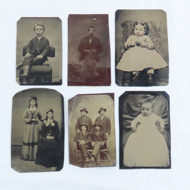18 Antique Tin Type Portraits - wagon scene is 7x5", .5 lbs Photos are part of description. (Live Auctioneers only shows a max of 20 photos). Please ask questions and read terms & conditions before bidding.