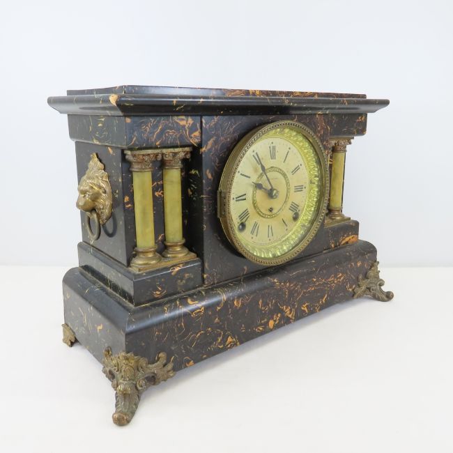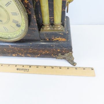 Seth Thomas Adamantine Mantle Clock- Works - Lion head handles, 4 columns, painted wood, good condition, with weight & key. Lot size: 15x10.5x7", 8.3lbs Photos are part of description. (Live Auctioneers only shows a max of 20 photos). Please ask questions and read terms & conditions before bidding.