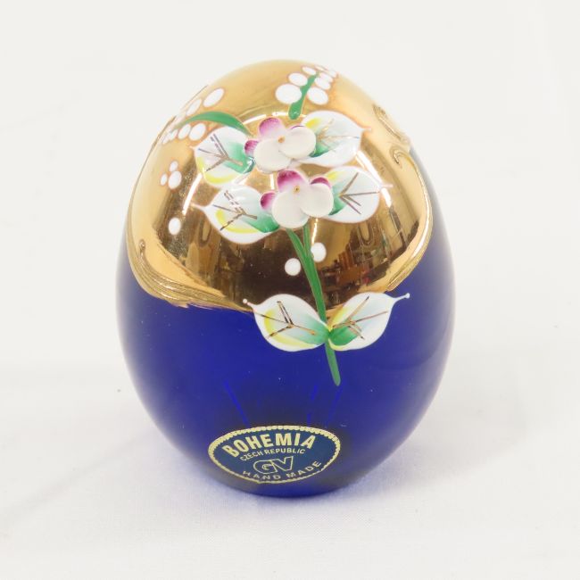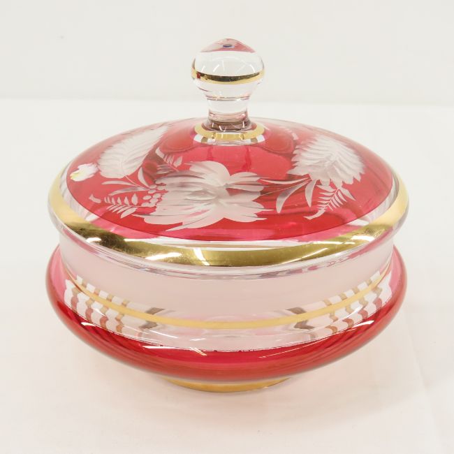 Vintage Glass Egg, 2 Lidded Jars & Bowl - Bohemian VG blue glass hand painted egg, Delaware Cranberry Bowl, Indiana Ruby Candy dish with lid. Bohemian covered dish, cut to clear lid. LOT SIZE 14X14X10" Photos are part of description. (Live Auctioneers only shows a max of 20 photos). Please ask questions and read terms & conditions before bidding.
