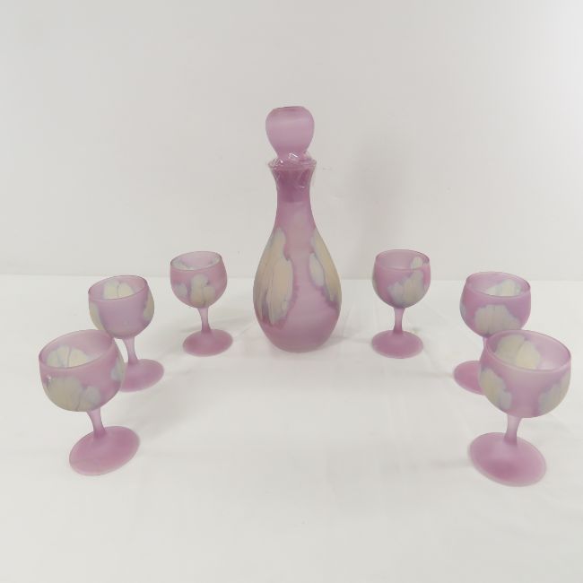 Rueven Style Art Nouveau Decanter & 6 Glass Set - LOT SIZE 12X12X12" 5 LB Photos are part of description. (Live Auctioneers only shows a max of 20 photos). Please ask questions and read terms & conditions before bidding.