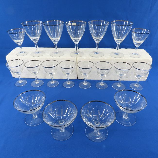 German Laurel Leaf Silver Rim Clear Glassware - 4 3.5" champagnes, 10 4.75" glasses, 5 6" glasses. No chips or cracks. Lot size: 18x15x6", 5 lbs Photos are part of description. (Live Auctioneers only shows a max of 20 photos). Please ask questions and read terms & conditions before bidding.