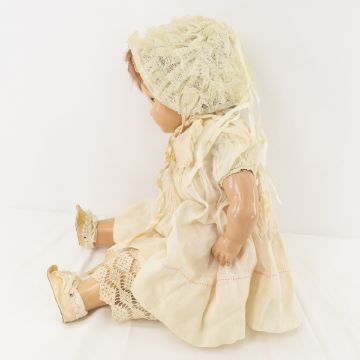 2 Antique Horsman Composition & Cloth Baby Dolls - Both have compo heads, arms and legs with cloth body, sleep eyes and closed mouths, mohair wigs, with not working criers. 1) 20" minor crazing throughout 2) 22" crazing throughout with damaged foot. All have beendisplayed- may not be complete or all original. Lot size:24x12x12", 5.6 lbs Photos are part of description. (Live Auctioneers only shows a max of 20 photos). Please ask questions and read terms & conditions before bidding.