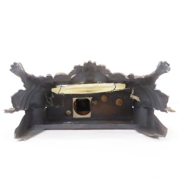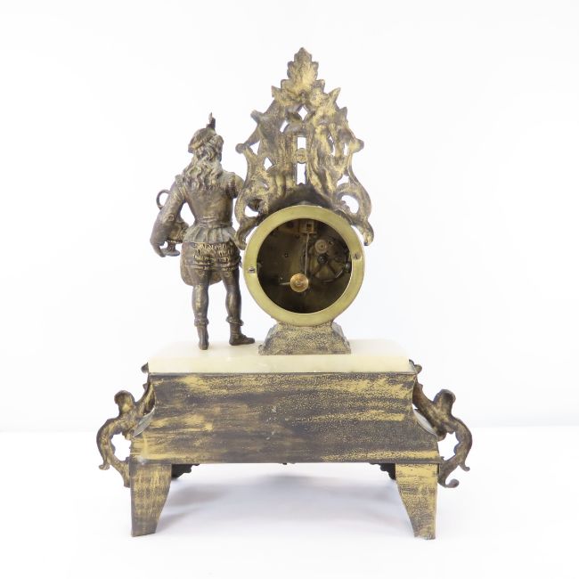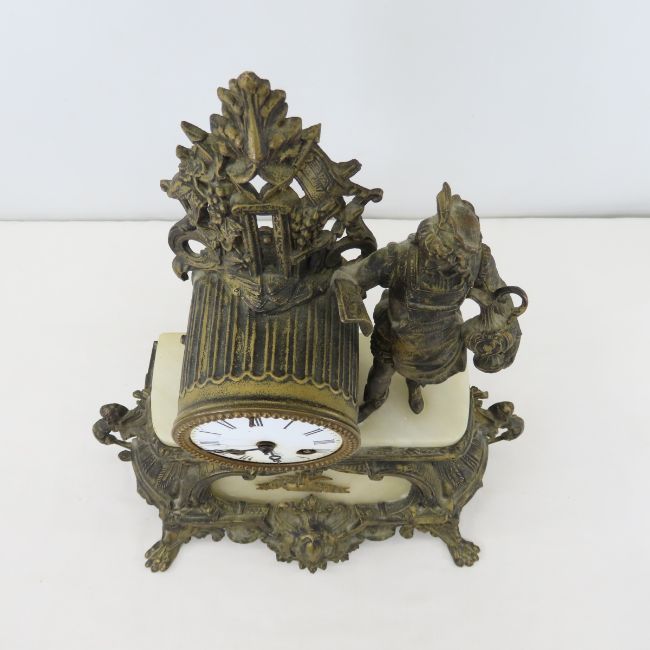 Metal & Marble French Style Mantle Clock - Only mark is 15711 on movement, Springs wind, pendulum doesn't seem to fit right, key is included. Stands 14" tall and weighs @ 5lb. missing glass face. LOT SIZE 16X14X6" 8 LB Photos are part of description. (Live Auctioneers only shows a max of 20 photos). Please ask questions and read terms & conditions before bidding.