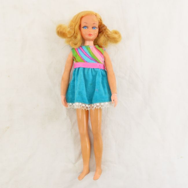 4 Skipper Dolls -1030,1105 (2) & 1117 - 1) Blonde Dramatic Living Skipper #1117 marked: "©1969 Mattel, Inc./Taiwan/U.S. & For. Patd./Other Pats.Pend /Patd. in Canada 1967". 2) Blonde #1030 Skipper bend leg- both feetmarked Japan. marked: " ©1963/Mattel, Inc" 3) Blonde TNT #1105 Skipper marked: Skipper: ©1967 Mattel, Inc./ U.S. Pat'd/U.S. Pats. Pend/ Made in Japan". 4) Cut blonde hair TNT #1105 Skipper marked : "©1967 Mattel, Inc./ U.S. Pat'd/U.S. Pats. Pend/ Made in Taiwan". Several Skipper outfit pieces. Lot size: 10x8x6", 1.5 lbs Photos are part of description. (Live Auctioneers only shows a max of 20 photos). Please ask questions and read terms & conditions before bidding.