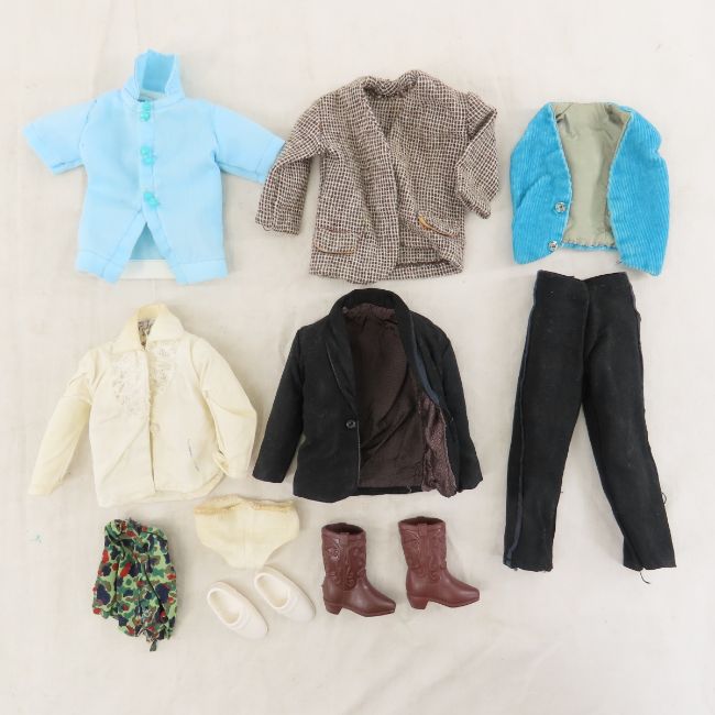 Sun Lovin' Malibu Ken, 1963 Ken - 1) 1963 blonde Ken marked: "Ken® ©1960 by Mattel, Inc. Hawthorne Calif. U.S.A."- has damaged thumbs. 2) Sun Lovin' Malibu Ken blonde marked: "1088 0500 5 ©Mattel Inc.1968 Hong Kong"- rightknee does not bend right 3) blonde Ken marked: "©1968 Mattel Malaysia". Some other clothes- white shirt marked England. Lot size: 14 x10x6" 1.5lbs Photos are part of description. (Live Auctioneers only shows a max of 20 photos). Please ask questions and read terms & conditions before bidding.