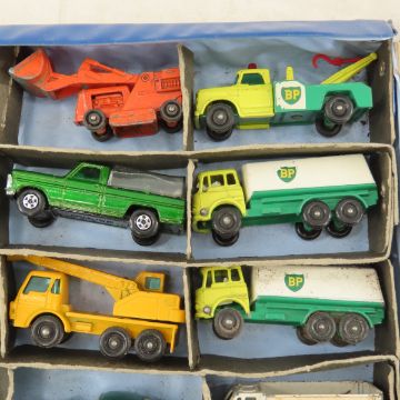2 Vintage Matchbox Cases Full w/ Service Vehicles - BP Gas Trucks, Dump Trucks, Tractors & Cars. Lot Size: 10 x 10 x 4", 6 lbs Photos are part of description. (Live Auctioneers only shows a max of 20 photos). Please ask questions and read terms & conditions before bidding.