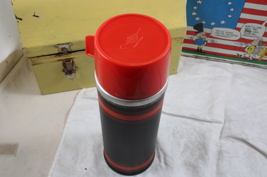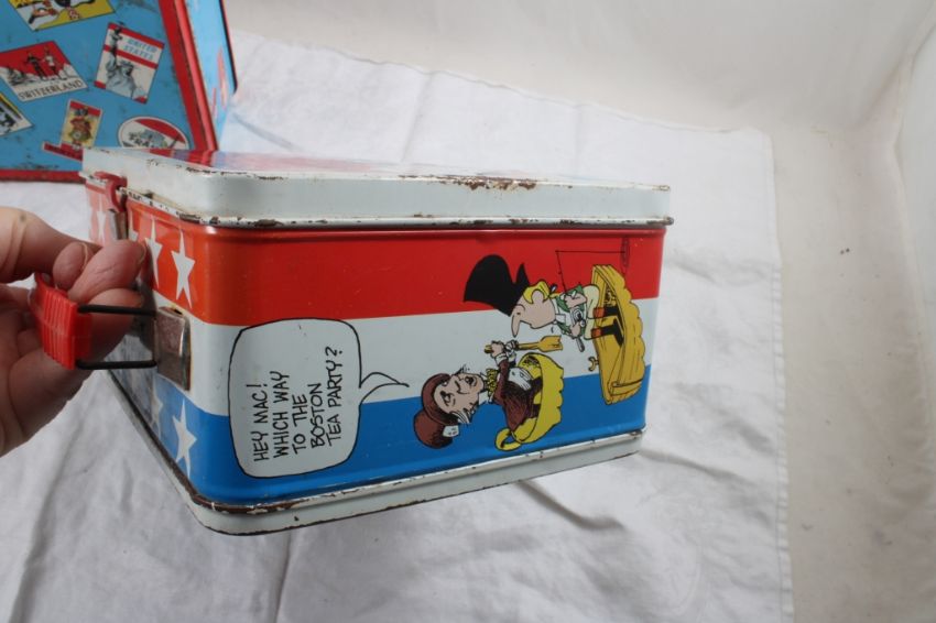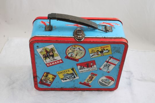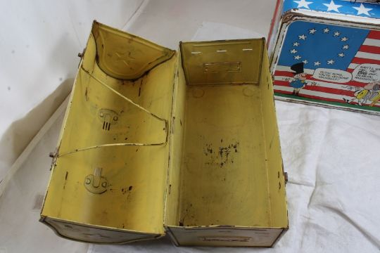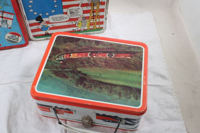 4 Vintage Metal Lunch Boxes - Patented 1940 with Thermos, CP Rail no Thermos, Ohio Art Travel No Thermos, Yankee Doodles No Thermos. Lot Size 12" x 8" x 16". 6 Lbs. Photos are part of description (Live Auctioneers only displays a max of 20 photos -check other platforms for all photos). Please ask questions and read terms & conditions before bidding.