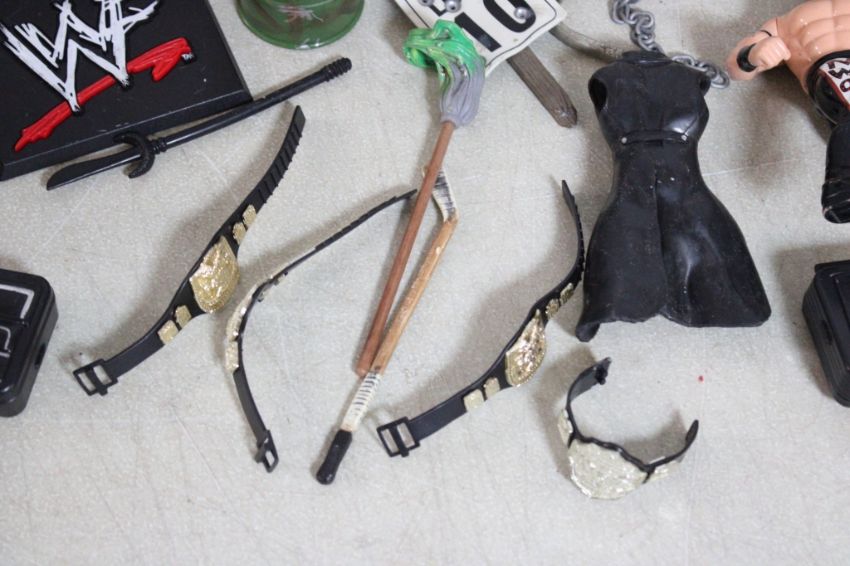 WWE WWFs Wrestle Mania Ring & 5 Wrestlers - & Accessories. Titan Tron Jakks Pacific. Lot Size 15" x 15" x 10". 5 Lbs. Photos are part of description (Live Auctioneers only displays a max of 20 photos -check other platforms for all photos). Please ask questions and read terms & conditions before bidding.