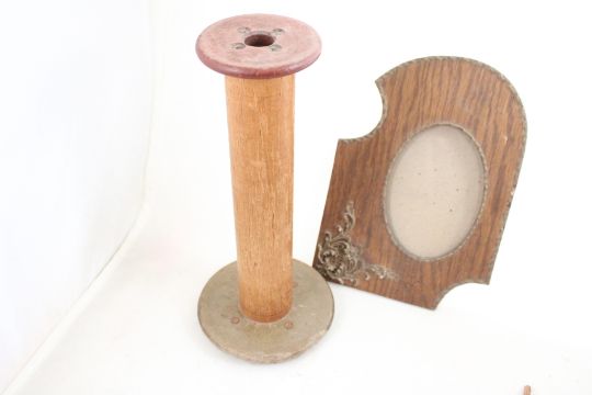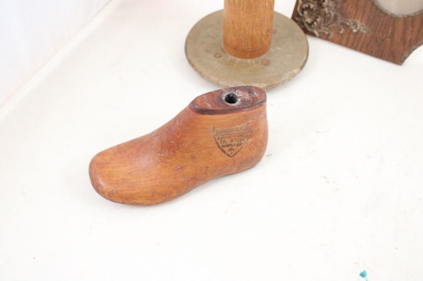 Wood Bobbins, Shoe Forms, Brushes, Drink Recipes - 2 Antique Wood Spool Bobbins, 2 Antique Wood Shoe Forms, 2 Antique Wood Advertising Clothes/Shoe Brushes and Wood Covered Alcoholic Drink Recipe Book. Lot Size 16" x 10" x 6". 5 Lbs. Photos are part of description (Live Auctioneers only displays a max of 20 photos -check other platforms for all photos). Please ask questions and read terms & conditions before bidding.