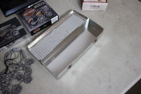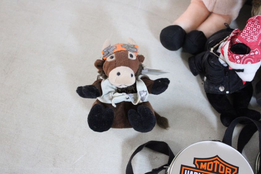 Harley Davidson Motorcycle Collectibles & Other - Harley Davidson Push Button Telephone (no cord), Stuffed Animals, Hallmark Harley Ornament (handlebar broken), Playing Cards Double Deck in Tin, 2003 Desk Daily Planner Calendar, Harley Shoulder Bags, andMotorcycle Wind Chime. Lot Size 223" x 16" x 13". 10 Lbs. Photos are part of description (Live Auctioneers only displays a max of 20 photos -check other platforms for all photos). Please ask questions and read terms & conditions before bidding.