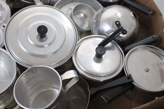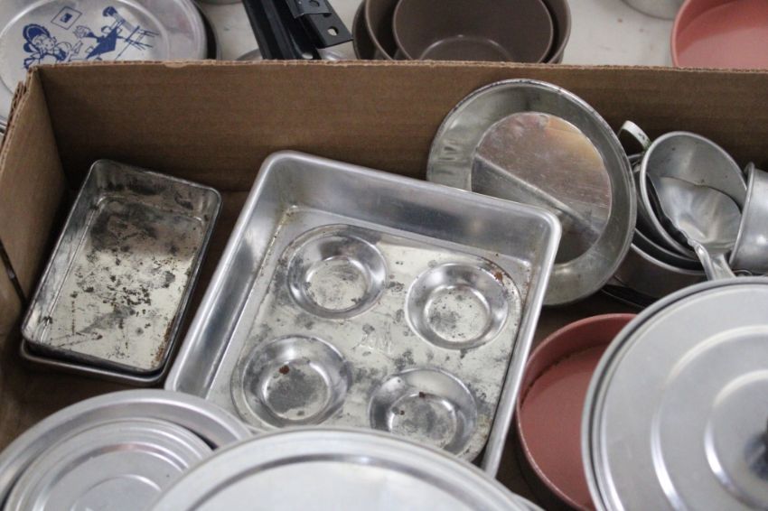 Child's Play Kitchen Bakeware, Dishware, Appliance - Pots, Pans, Kitchen Appliances, Plastic and Aluminum Tin Child's Play large lot. Lot Size 18" x 13" x 10". 4 Lbs. Photos are part of description (Live Auctioneers only displays a max of 20 photos -check other platforms for all photos). Please ask questions and read terms & conditions before bidding.