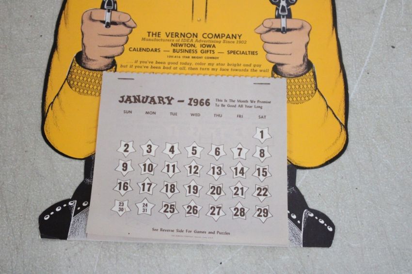 1935 Kellogg Co. Freckles Frog Framed Pillow Cloth - Plus Vernon Company Newton, Iowa 1966 2 Sided Cowboys Western Themed Cardboard Calendar. Lot Size 23" x 19" x 2". 5 Lbs. Photos are part of description (Live Auctioneers only displays a max of 20 photos -check other platforms for all photos). Please ask questions and read terms & conditions before bidding.