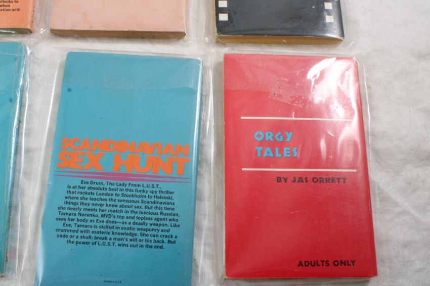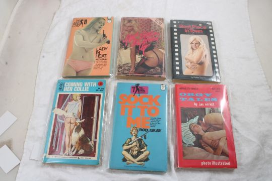 6 Erotica Risque Adult Books - Orgy Tales Photo Illustrated, Best Piece in Town, Hot Sister All Grown Up, Lady in Heat, Sock It To Me, Coming with Her Collie. Lot Size 8" x 5" x 3". 2 Lbs. Photos are part of description (Live Auctioneers only displays a max of 20 photos -check other platforms for all photos). Please ask questions and read terms & conditions before bidding.