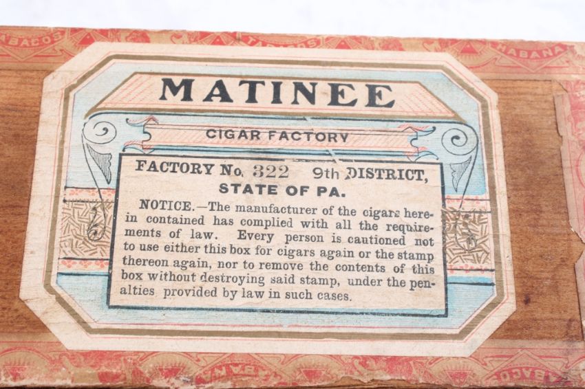 Antique Cigar Store Display Box, Labels, Cloths - Matinee Cigar Wooden Store Display Box with Cigar Box Labels & Cloths. Lot Size 14" x 5" x 4". 1 Lb. Photos are part of description (Live Auctioneers only displays a max of 20 photos -check other platforms for all photos). Please ask questions and read terms & conditions before bidding.