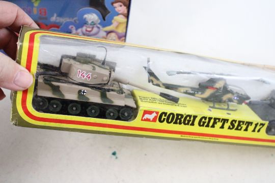 Vintage Toys Corgi Gift Set, Disney DVD Bingo - Joal Compact Caterpillar, U S Army Plastic Tank, Semi Tractor. Lot Size 15" x 12" x 12". 5 Lbs. Photos are part of description (Live Auctioneers only displays a max of 20 photos -check other platforms for all photos). Please ask questions and read terms & conditions before bidding.