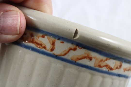 Red Wing Sponge Band Grey Line Jar and Custard Cup - Red Wing Sponge Band Grey Line Pantry Jar, no lid (has a hairline & small chip on rim) and Red Wing 4" custard cup. Lot Size 4.5" x 4.5" x 4". 2 Lbs. Photos are part of description (Live Auctioneers only displays a max of 20 photos -check other platforms for all photos). Please ask questions and read terms & conditions before bidding.