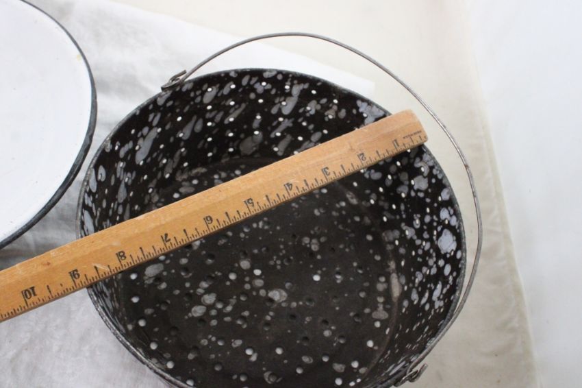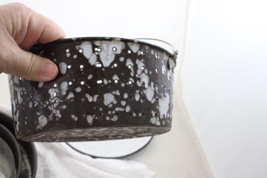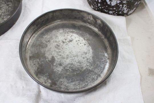 Vintage Kitchen Graniteware, Pans, Opener, Cutter - Screw Top Edlund Top Off Opener, Rapid Slaw & Vegetable Cutter with Box (box shows wear), Graniteware Collander, Cake Pans. Lot Size 13" x 13" x 6". 5 Lbs. Photos are part of description (Live Auctioneers only displays a max of 20 photos -check other platforms for all photos). Please ask questions and read terms & conditions before bidding.