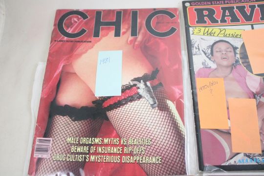 4 Risque Nude Men's Magazines - Chic 1981, Raven 70's 80's, Cavalier 1979, Gallery 1977. Lot Size 11" x 9" x 2". 3 Lbs. Photos are part of description (Live Auctioneers only displays a max of 20 photos -check other platforms for all photos). Please ask questions and read terms & conditions before bidding.