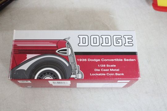 4 NIB Diecast Cars, 2 Revell Trucks, Erector Motor - 4 New in Boxes Diecast Cars 1936 Dodge Convertible Sedan, 1936 Dodge, 1928 Chevrolet National AB, 1957 Chevrolet Belair, Revell Plastic TV Truck and Revell Plumbing Service Plastic Truck, Gilbert Erector 1950'sEngine Motor. Lot Size 15" x 15" x 9". 8 Lbs. Photos are part of description (Live Auctioneers only displays a max of 20 photos -check other platforms for all photos). Please ask questions and read terms & conditions before bidding.