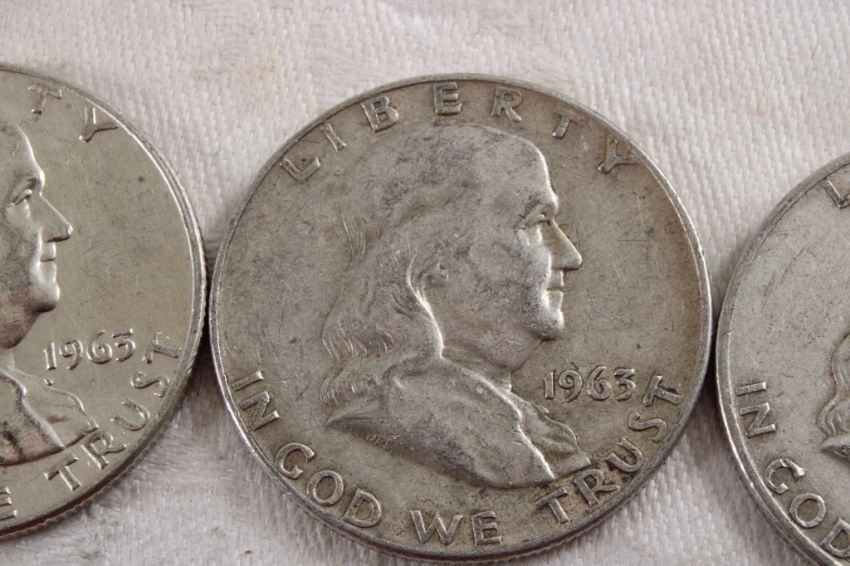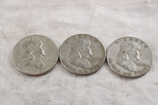 3 Franklin Silver Half Dollars - Lot Size 3" x 2" x 1". 1 Lb. Photos are part of description (Live Auctioneers only displays a max of 20 photos -check other platforms for all photos). Please ask questions and read terms & conditions before bidding.