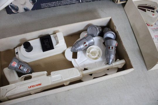 1978 Tomy Space Game & Milton Bradley Star Bird - 1978 Tomy Shoot Out in Space Combat Game in Box and Milton Bradley Electronic Star Bird with Box and Instructions (as Is). Lot Size 19.5" x 14" x 8". 5 Lbs. Photos are part of description (Live Auctioneers only displays a max of 20 photos -check other platforms for all photos). Please ask questions and read terms & conditions before bidding.